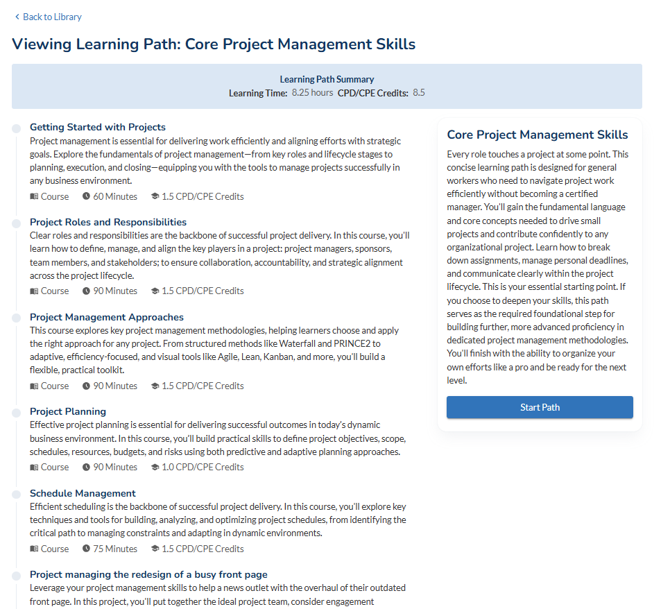 When reviewing a learning path course you will see how long the each course will take and how many CPE/CPE Credits they award.