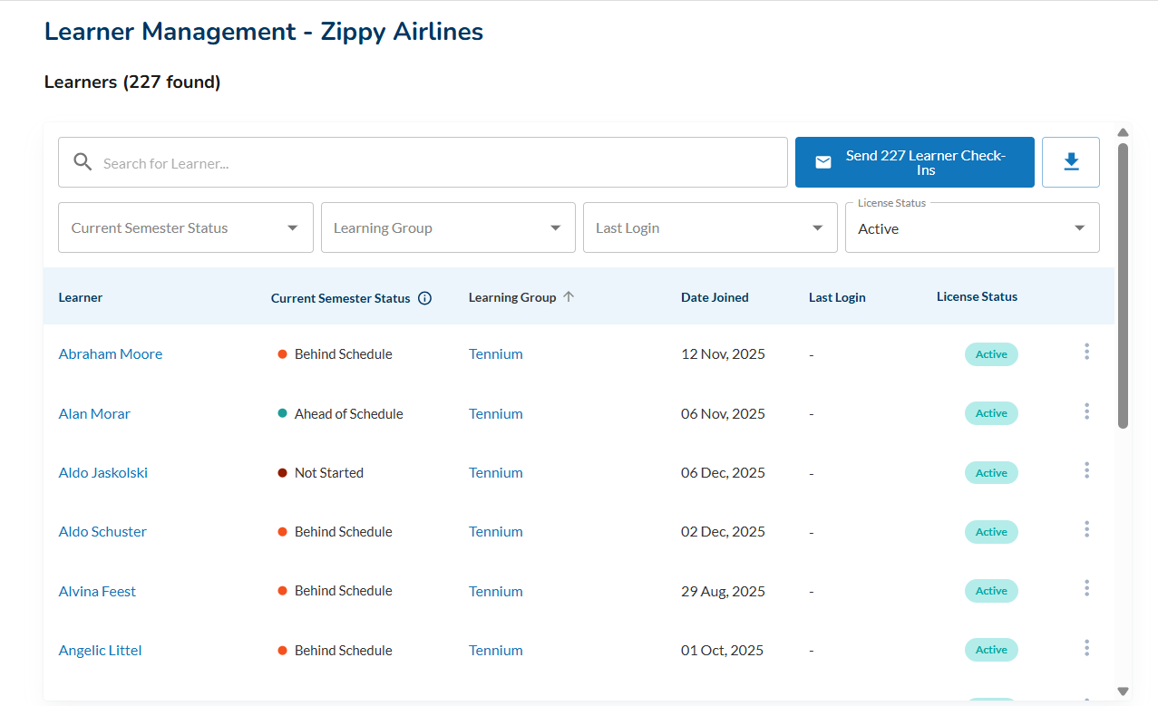 Download Learner List: export a comprehensive list of your learners for record-keeping, reporting, or further analysis. The download feature on the Learner Management Screen allows you to generate a user-friendly report containing essential information such as names, email addresses, learning group affiliations and status.