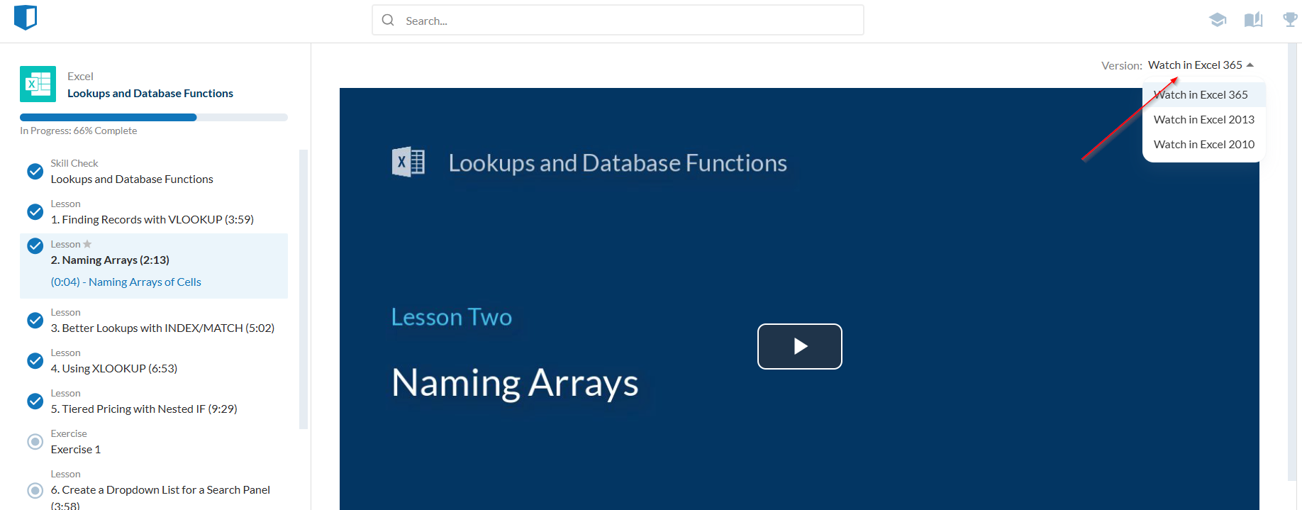 You can always switch versions within every course for the Excel, Financial Modeling and PowerPoint. This can be changed through the toggle on the toggle on the lesson screen. However, this functionality is not available for other Subjects. Tableau, Power BI and Alteryx versions can vary substantially, so this behavior is restricted for these Subjects when mandated. Word, Outlook and Statistical Analysis Subjects do not have multiple versions and are therefore not relevant to this consideration.